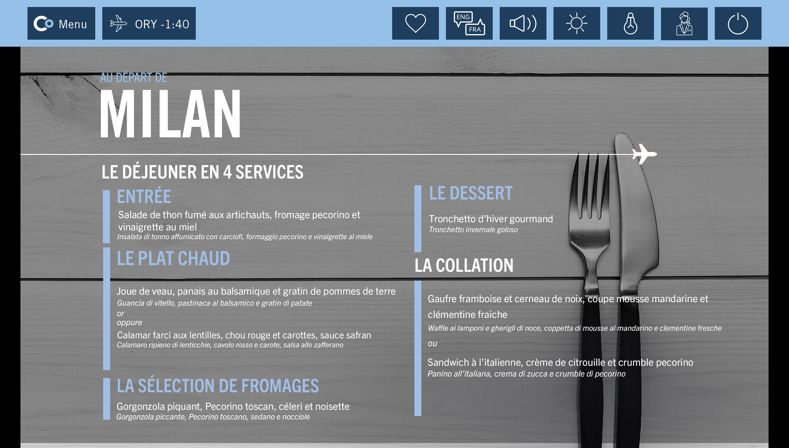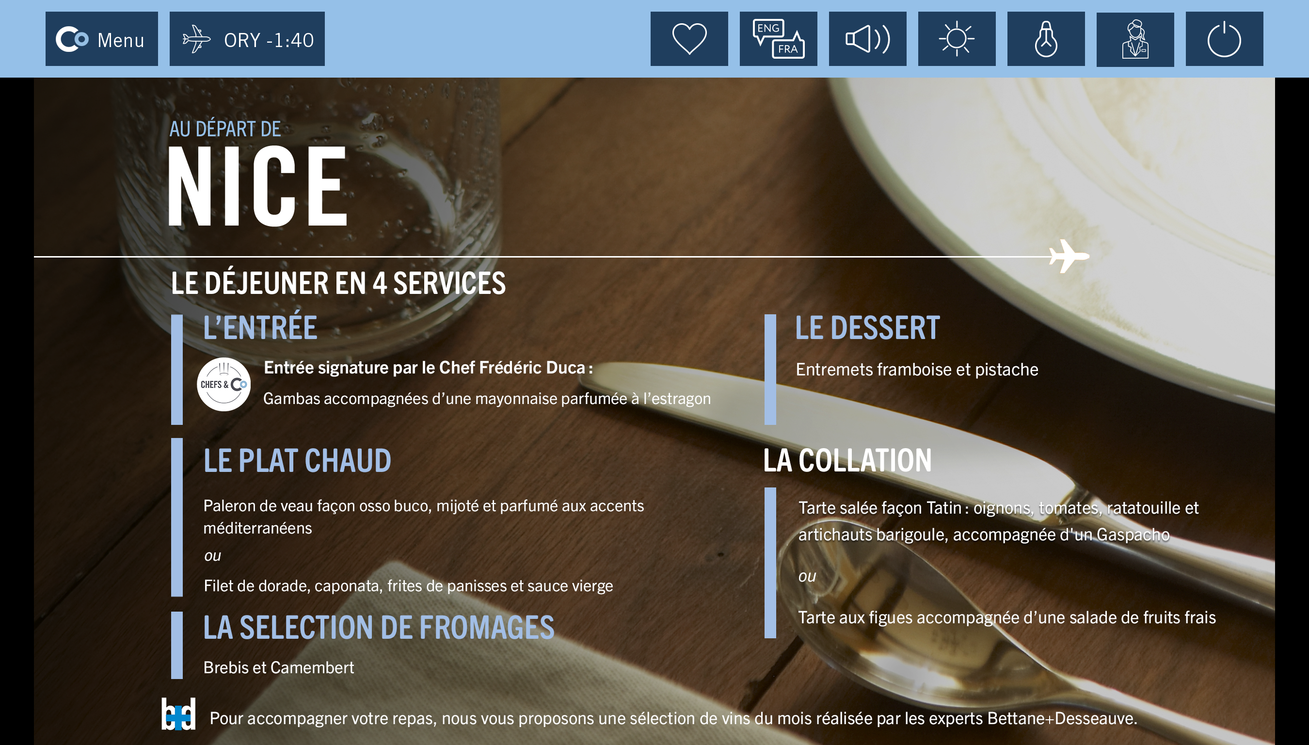 Après le décollage dégustez un menu 4 plats composé d'une entrée froide, d'un plat chaud au choix parmi deux suggestions, d'un fromage et d'un dessert.